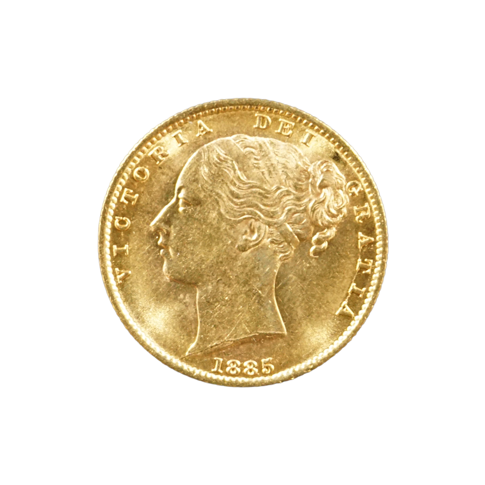 Moeda de ouro original do Reino Unido datada do ano de 1885.